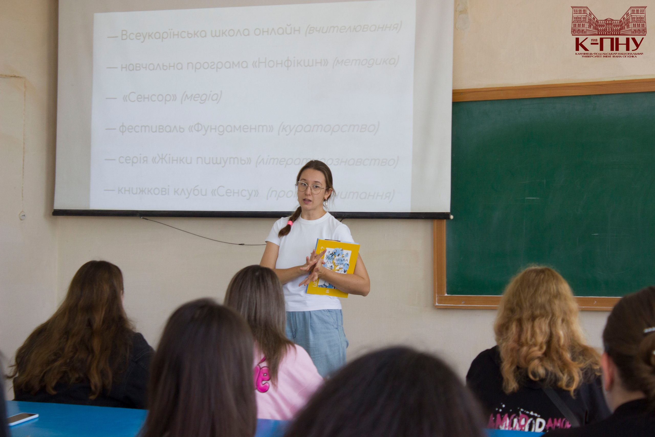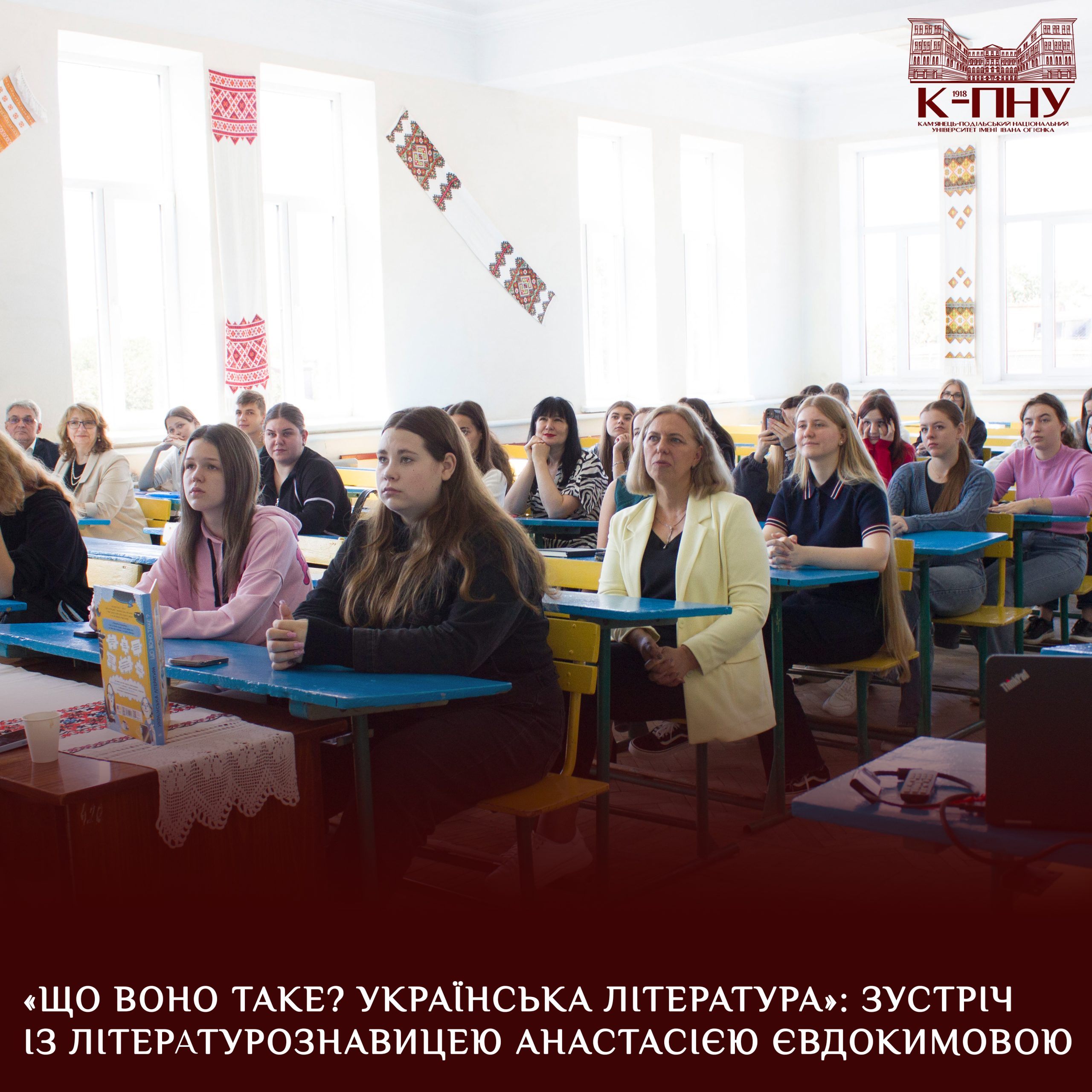 16 вересня цього року у «світлиці-вітальні» ННІ української філології та журналістики Кам’янець-Подільського національного університету імені Івана Огієнка відбулось чергове літературне зібрання, приурочене презентації книги-енциклопедії літературознавиці, культурної менеджерки, а в минулому – вчительки української літератури – Анастасії Євдокимової «Що воно таке? Українська література», у якому взяли участь здобувачі вищої освіти спеціальностей В11 Філологія (Українська мова і література), А4 Середня освіта (Українська мова і література), С7 Журналістика, 035 Філологія (Українська мова і література), 014 Середня освіта (Українська мова і література) та 061 Журналістика першого (бакалаврського) та другого (магістерського) рівнів вищої освіти. Окрім студентів та викладачів ННІ української філології та журналістики, на захід завітали й стейкхолдери, що є постійними й завжди очікуваними гостями ННІ української філології та журналістики, зокрема Наталія Золочевська, учителька української мови та літератури Кам’янець-Подільського ліцею № 5.