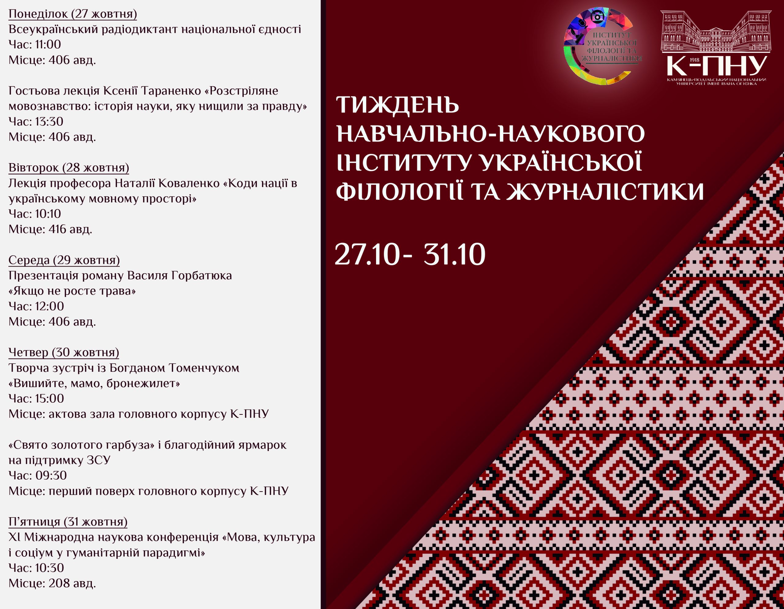 До Дня української писемності та мови в Кам’янець-Подільському національному університеті імені Івана Огієнка відбувається тиждень навчально-наукового інституту української філології та журналістики з 27 до 31 жовтня.