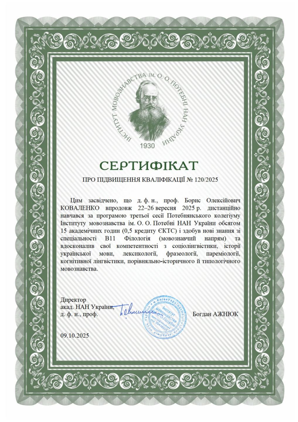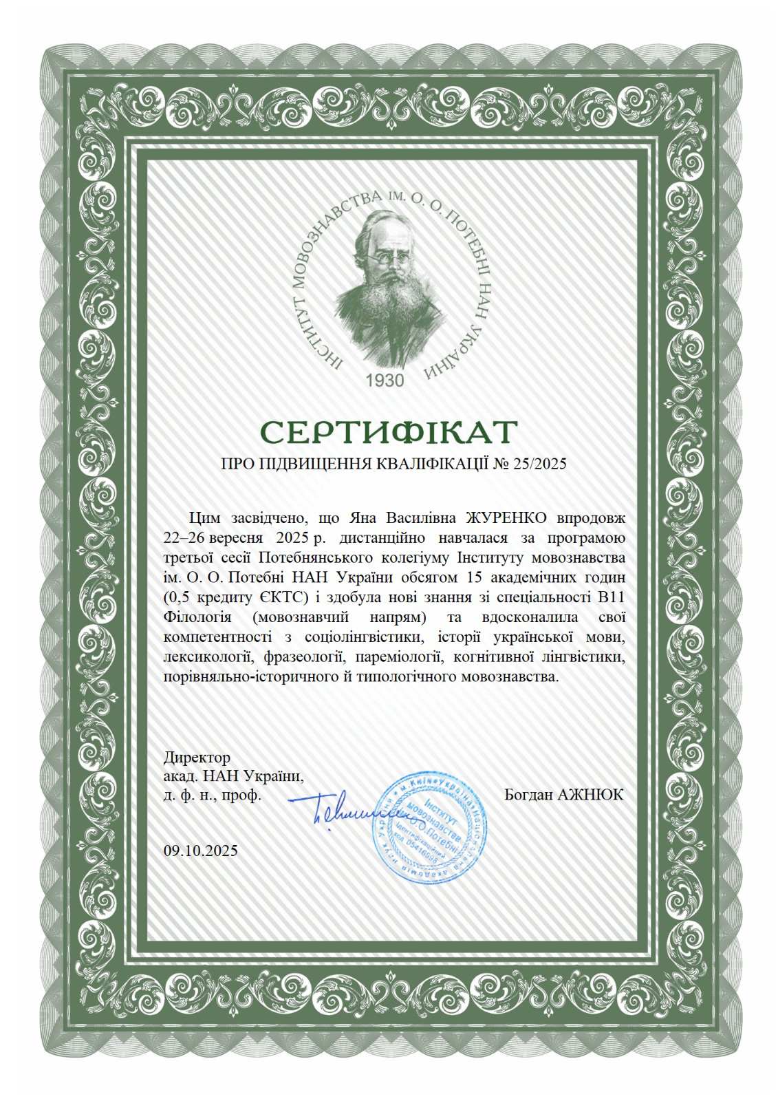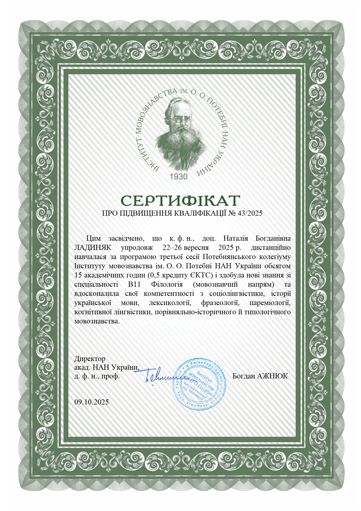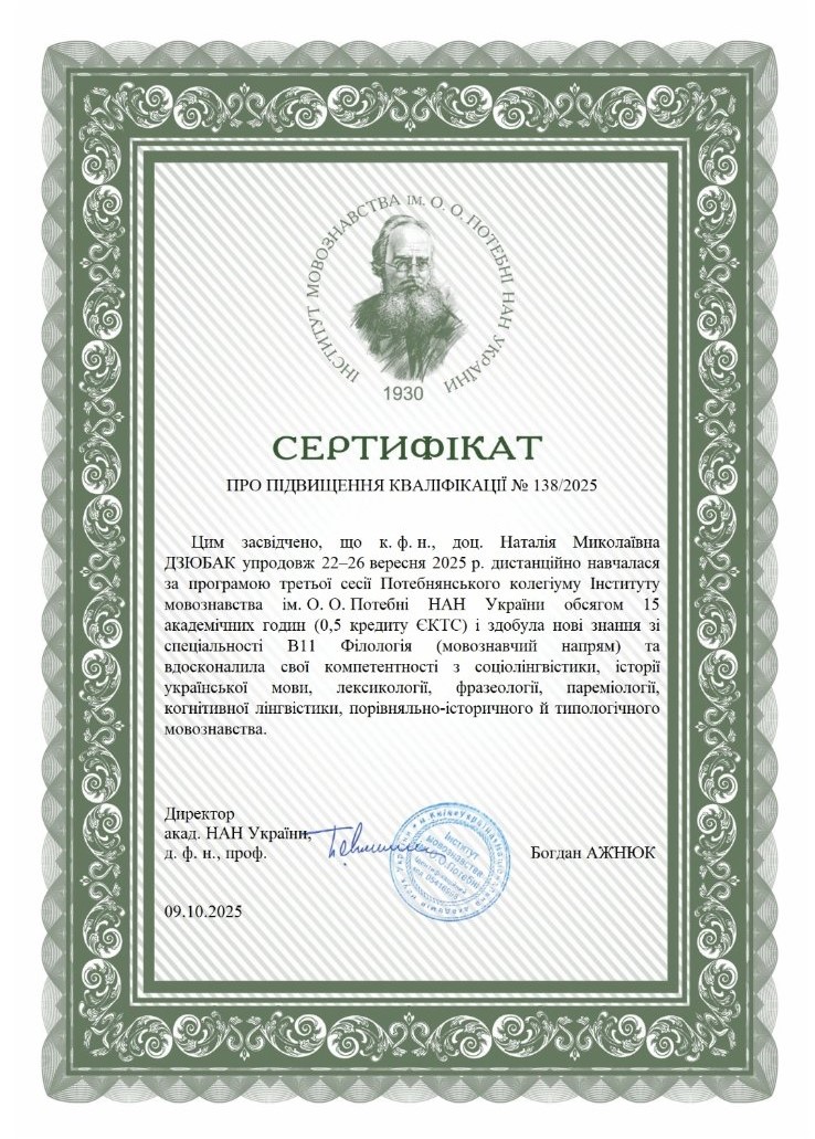 Упродовж 22-26 вересня 2025 року тривала третя сесія Потебнянського колегіуму, мета якої – поглиблення знань у галузях соціолінгвістики, історії української мови, лексикології, фразеології, пареміології, когнітивної лінгвістики, порівняльно-історичного й типологічного мовознавства. Обсяг здобутої інформації уможливлює орієнтування в сучасних тенденціях розвитку лінгвістики для здійснення наукової та викладацької діяльності зі спеціальності В11 Філологія (мовознавчий напрям). Організатор підвищення кваліфікації – Інститут мовознавства ім. О.О.Потебні НАН України.