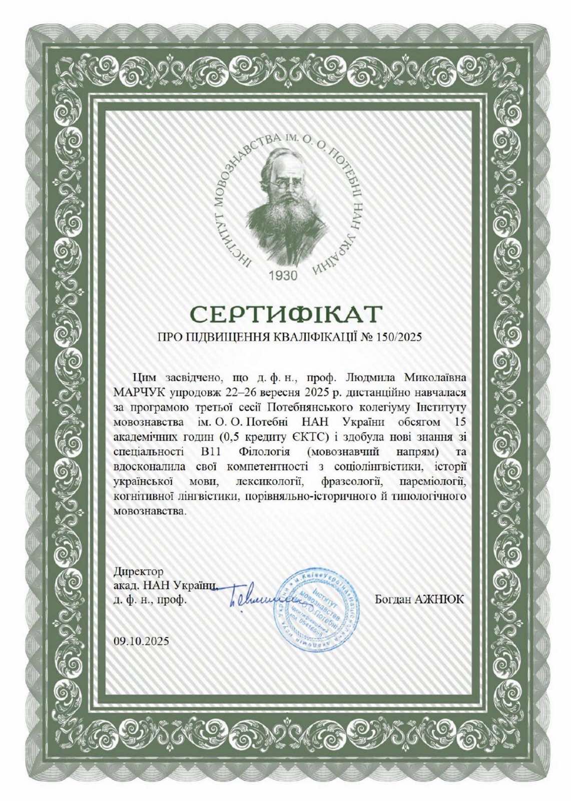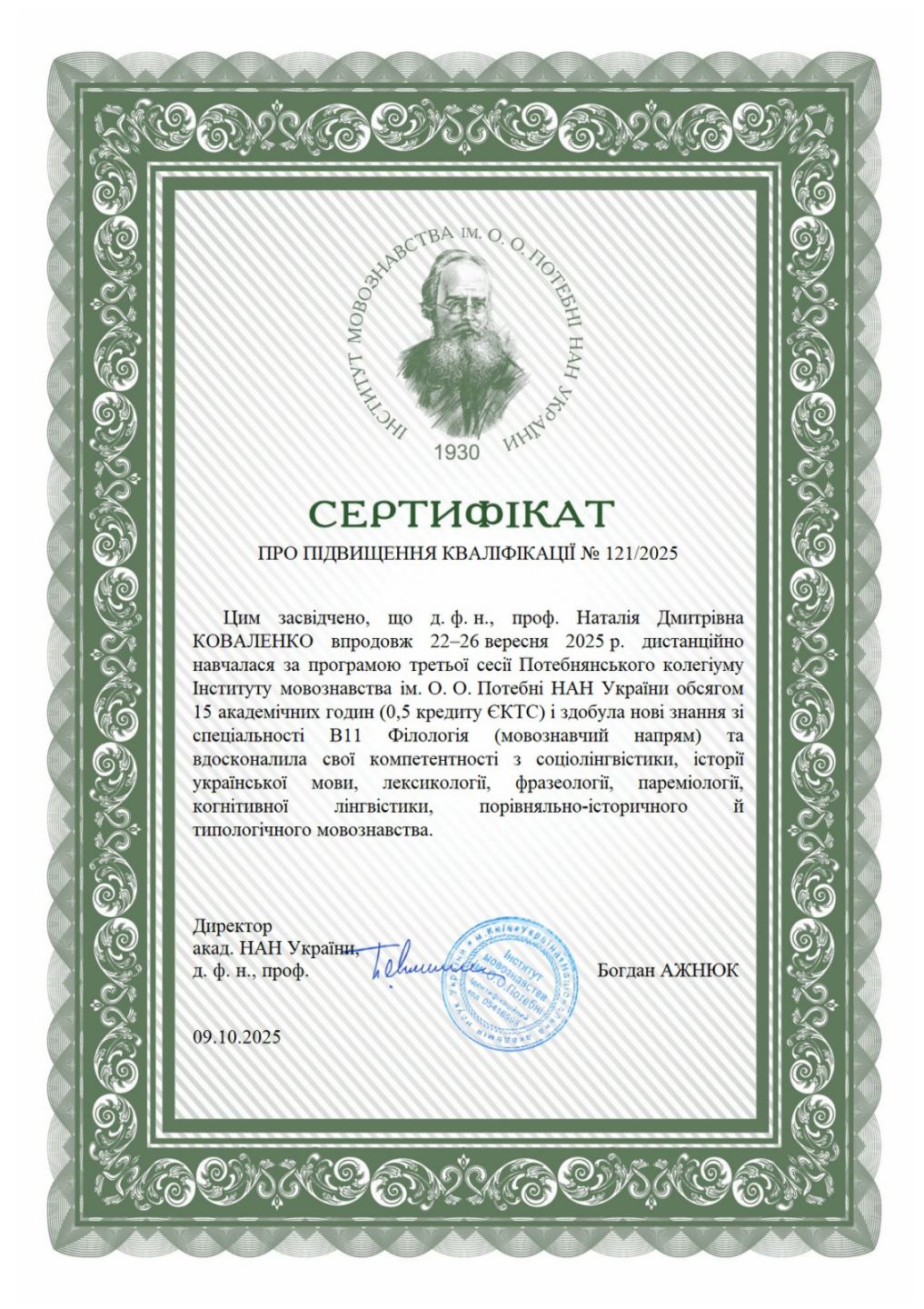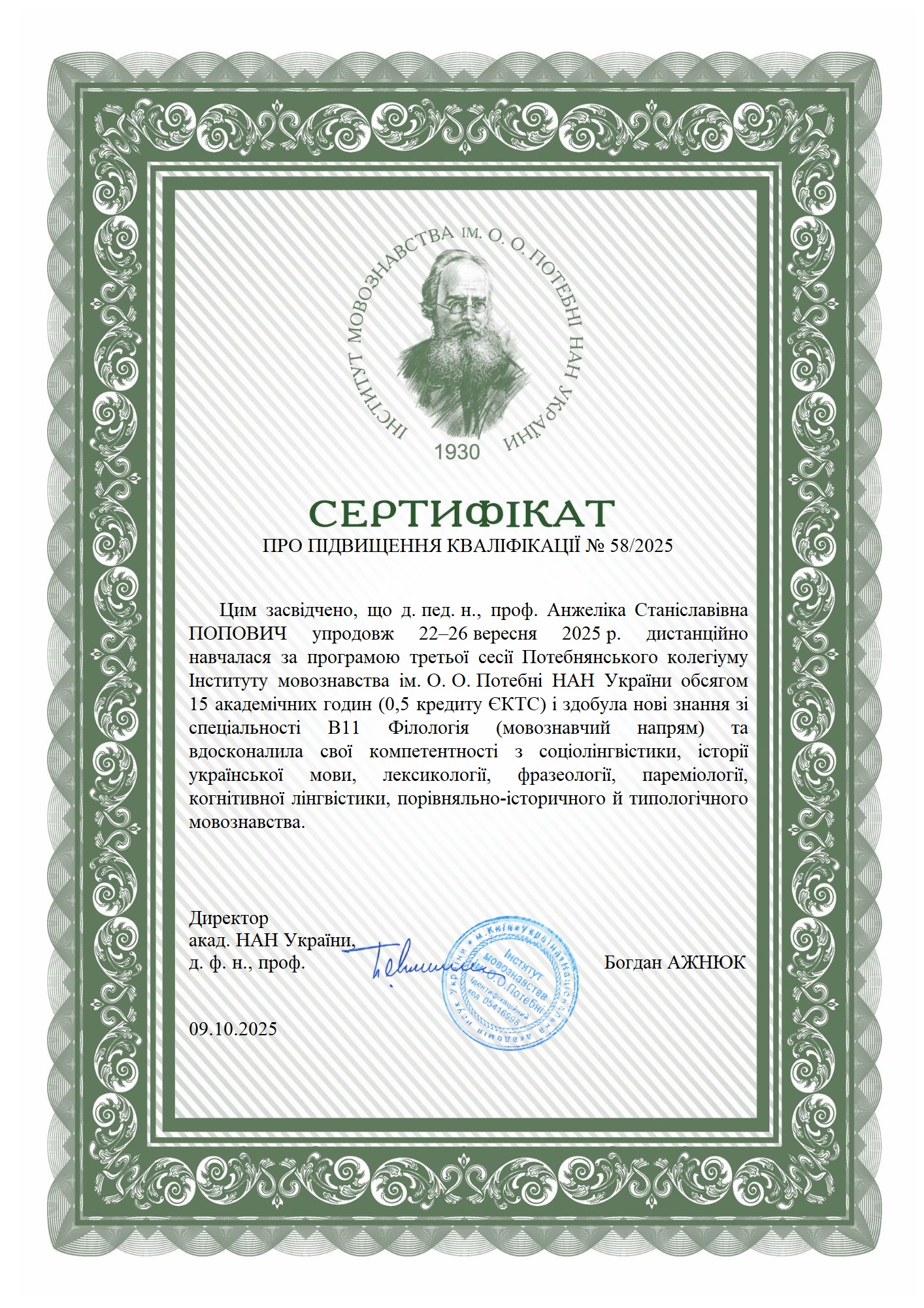 Упродовж 22-26 вересня 2025 року тривала третя сесія Потебнянського колегіуму, мета якої – поглиблення знань у галузях соціолінгвістики, історії української мови, лексикології, фразеології, пареміології, когнітивної лінгвістики, порівняльно-історичного й типологічного мовознавства. Обсяг здобутої інформації уможливлює орієнтування в сучасних тенденціях розвитку лінгвістики для здійснення наукової та викладацької діяльності зі спеціальності В11 Філологія (мовознавчий напрям). Організатор підвищення кваліфікації – Інститут мовознавства ім. О.О.Потебні НАН України.