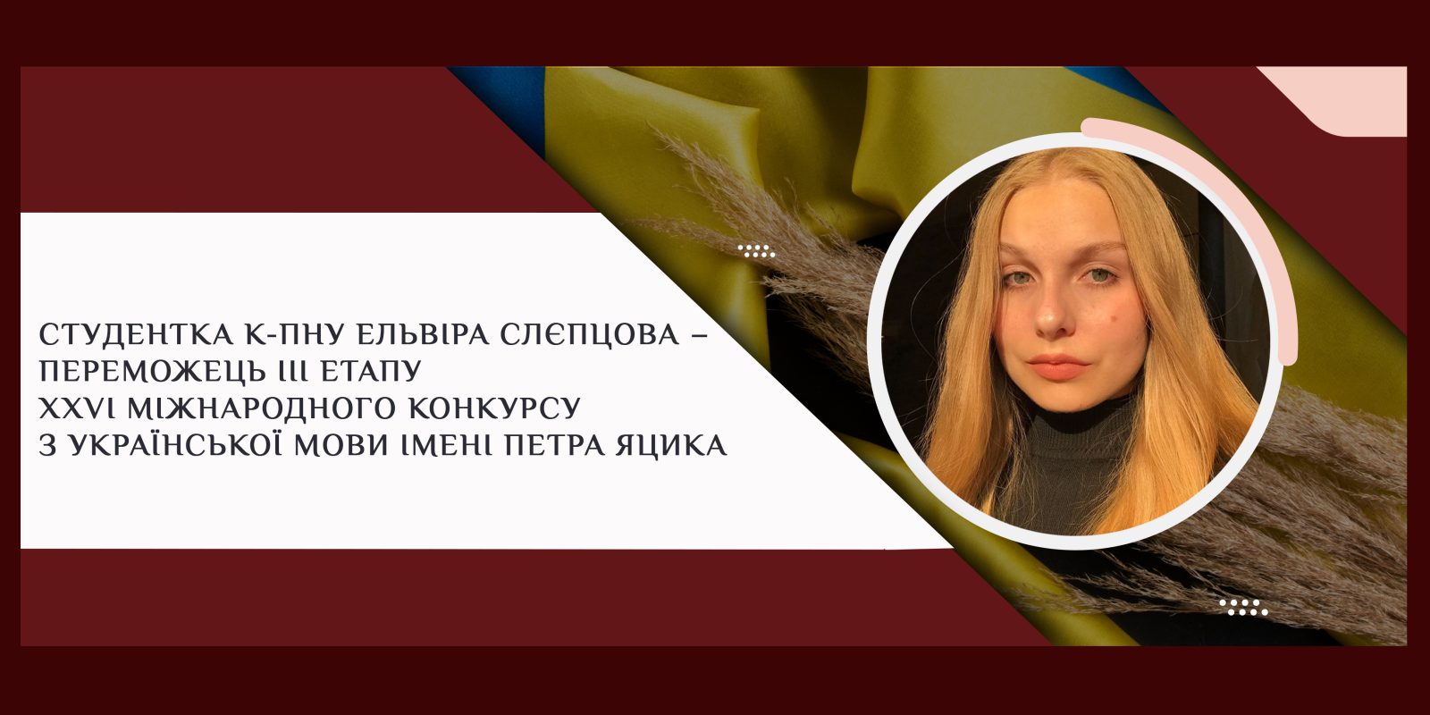 Вітаємо здобувачку навчально-наукового інституту української філології та журналістики першого (бакалаврського) рівня вищої освіти спеціальності 014 Середня освіта (Українська мова і література) Ельвіру Слєпцову з перемогою в ІІІ етапі (обласному) ХХІV Міжнародного конкурсу з української мови імені Петра Яцика (науковий керівник – кандидат філологічних наук, доцент, завідувач кафедри української мови Інна Беркещук).