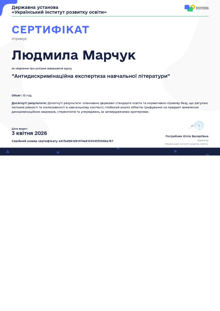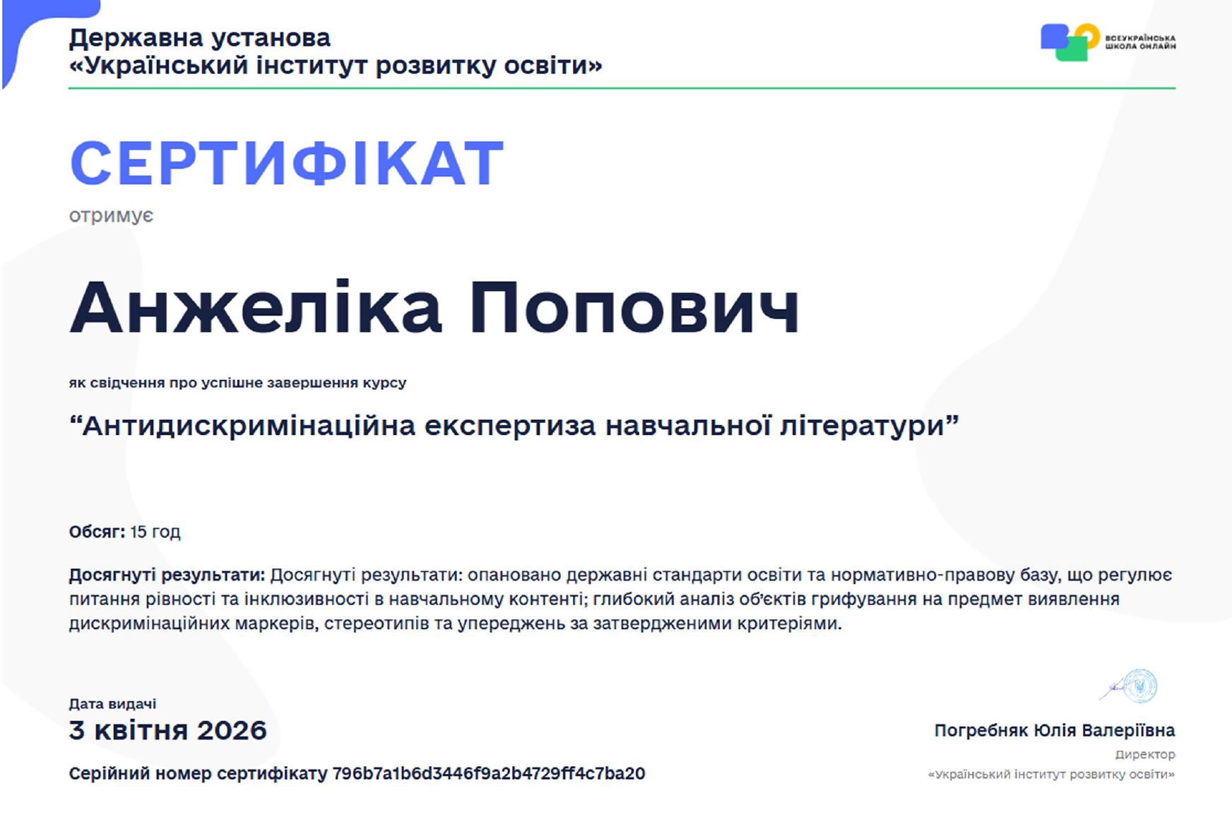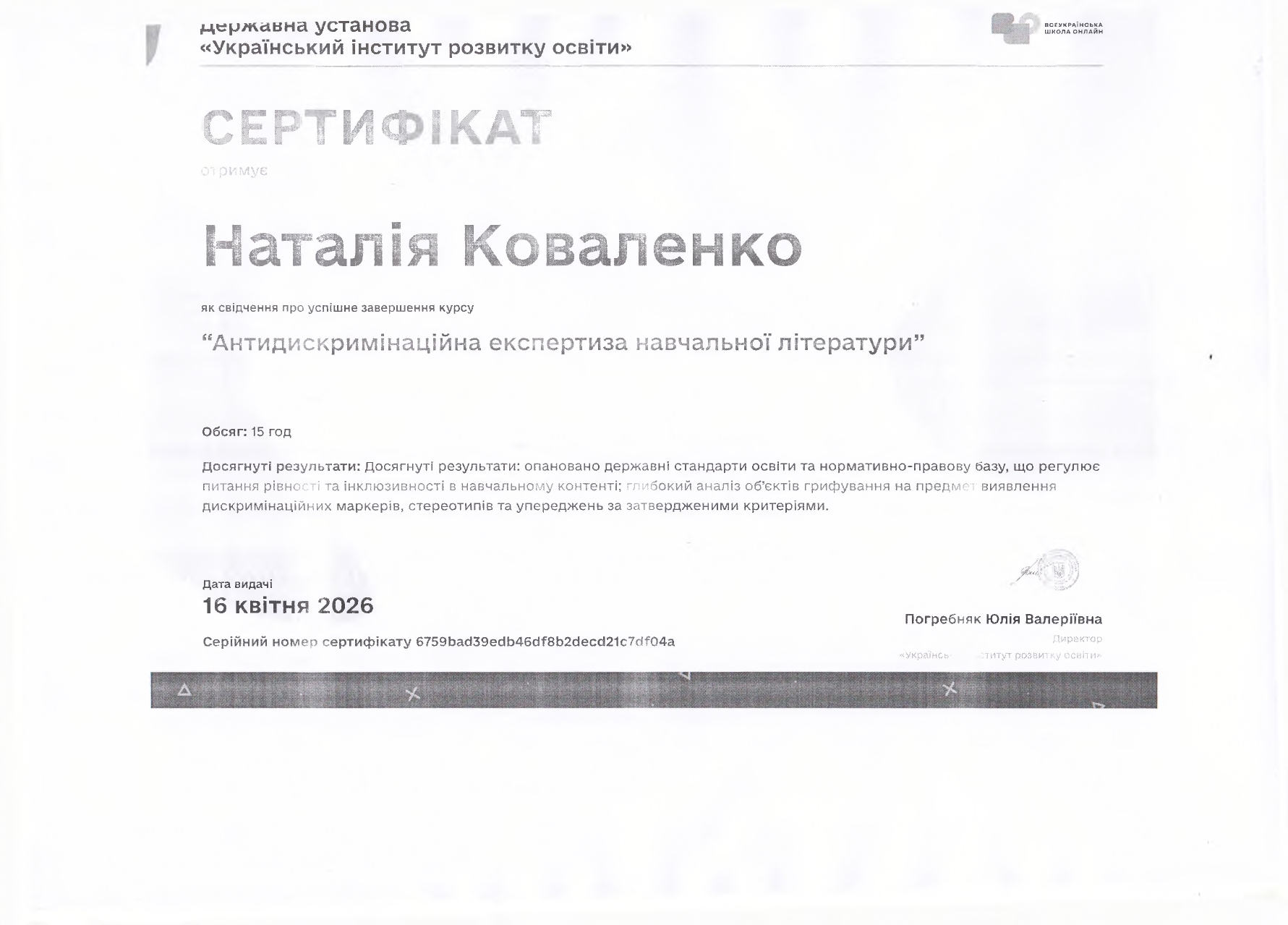 - опанували курси «Школа експертів» (15 год) та «Антидискримінаційна експертиза навчальної літератури» (15 год) державної установи «Український інститут розвитку освіти»;