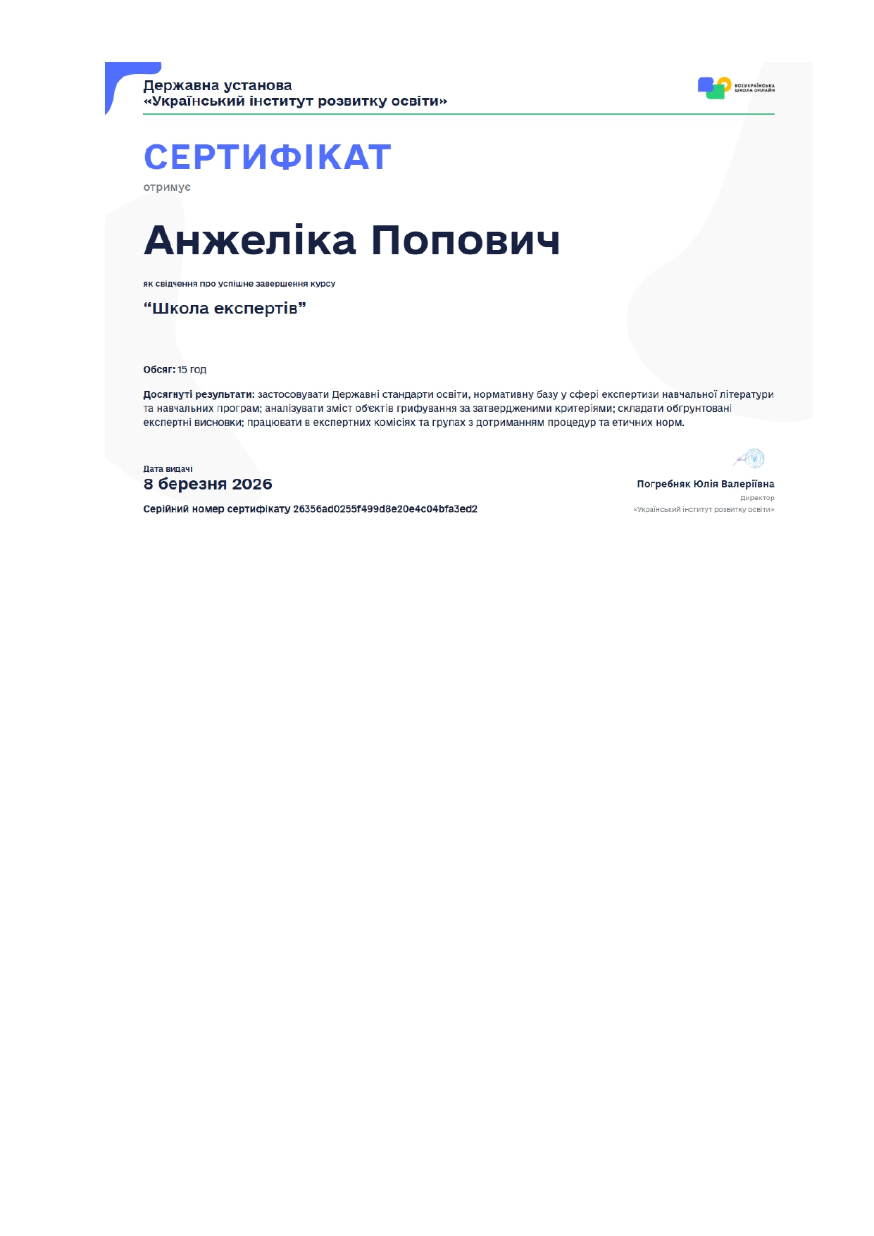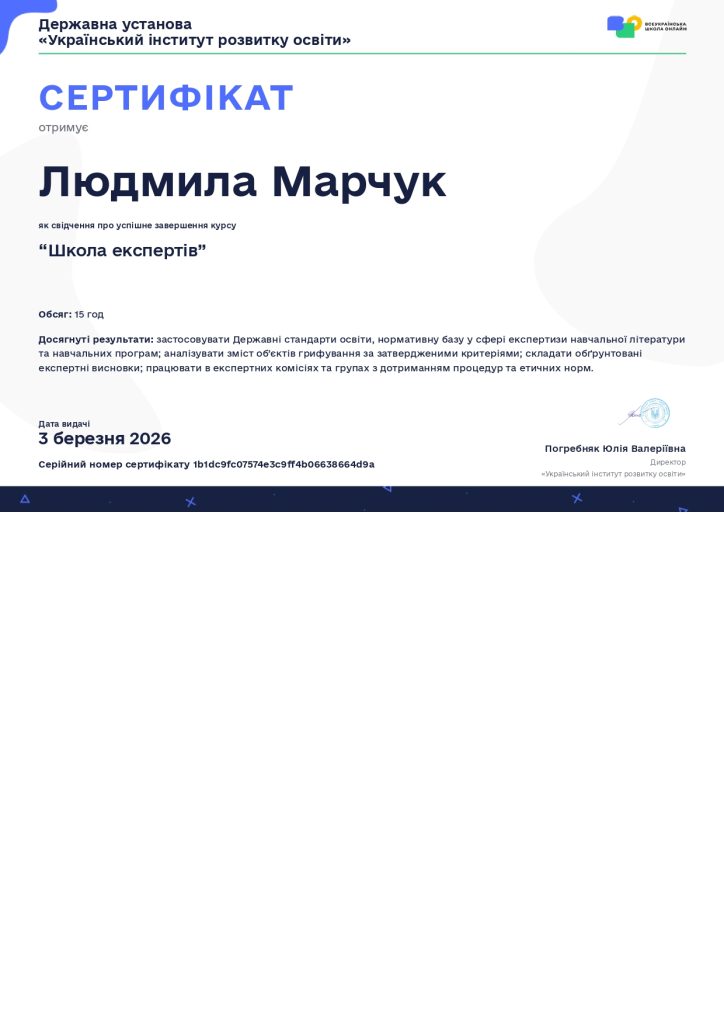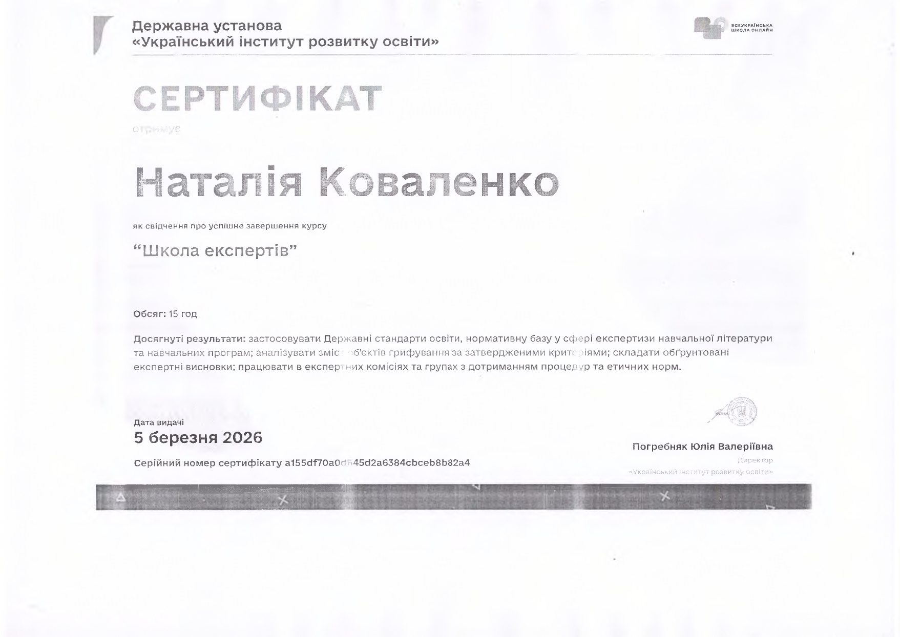 - опанували курси «Школа експертів» (15 год) та «Антидискримінаційна експертиза навчальної літератури» (15 год) державної установи «Український інститут розвитку освіти»;