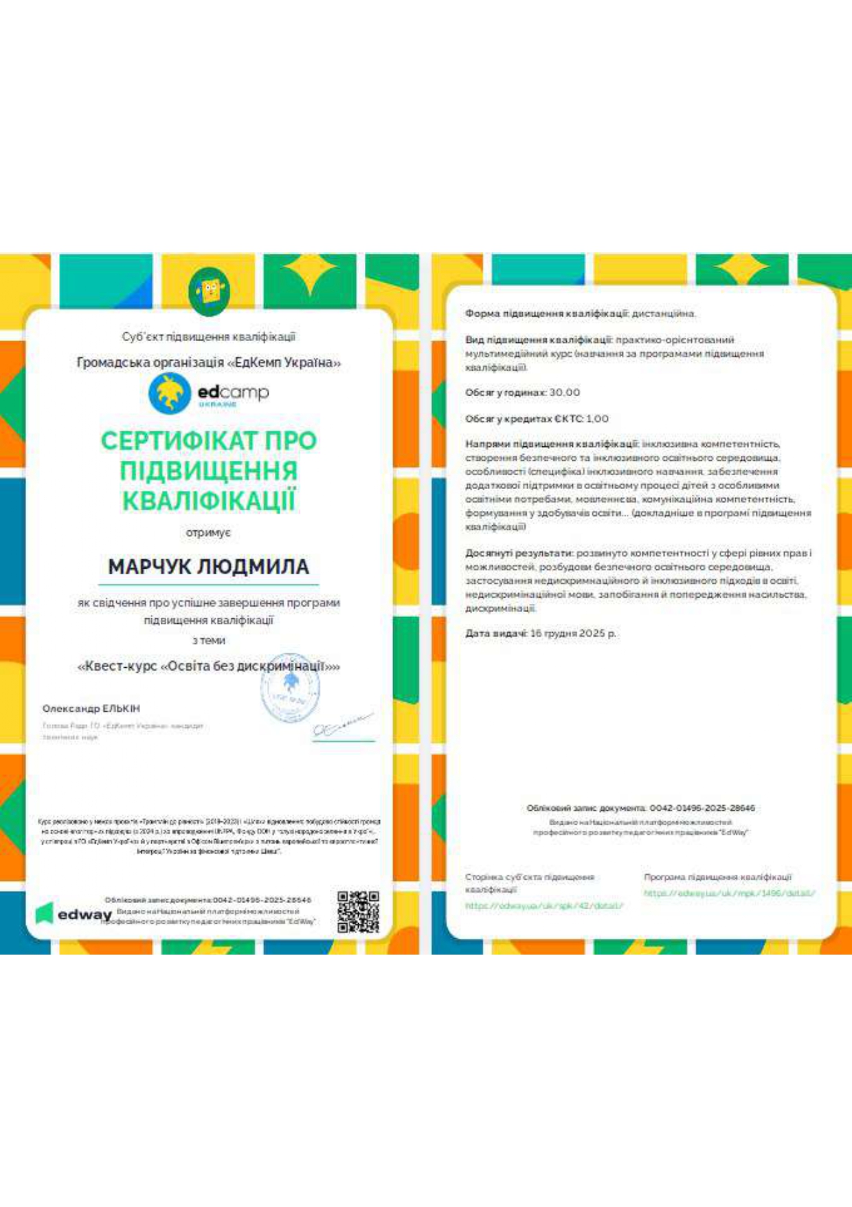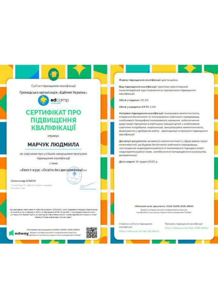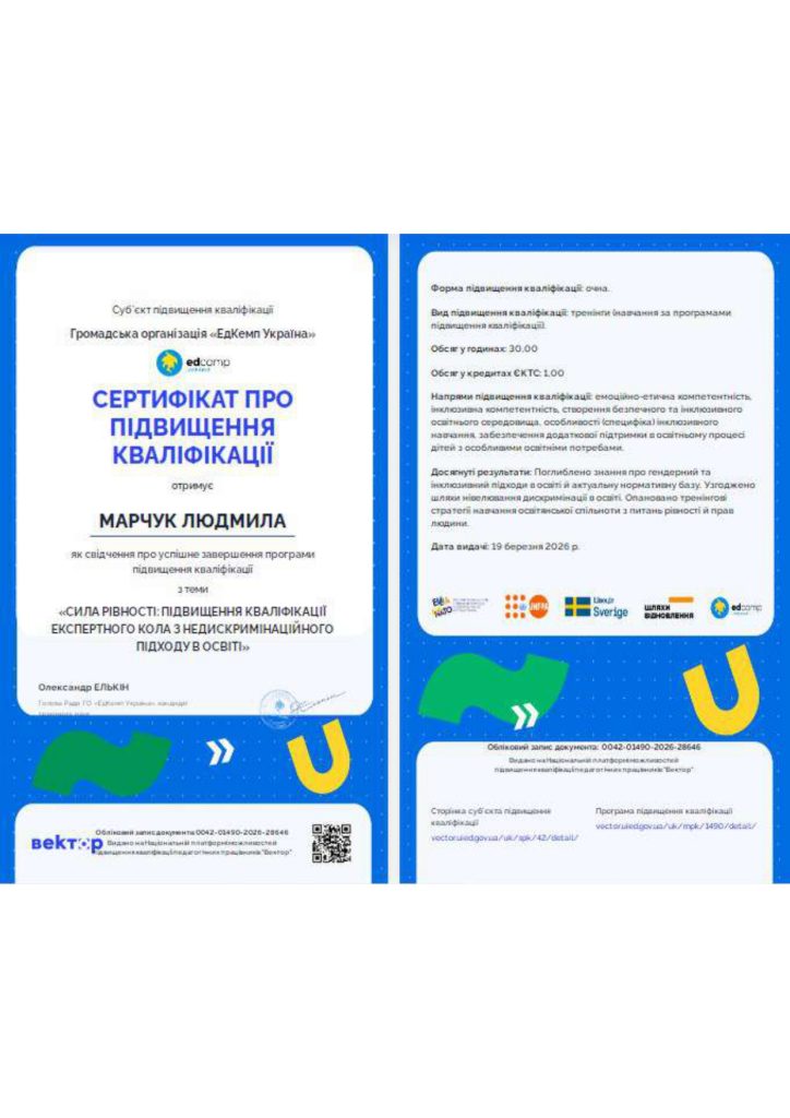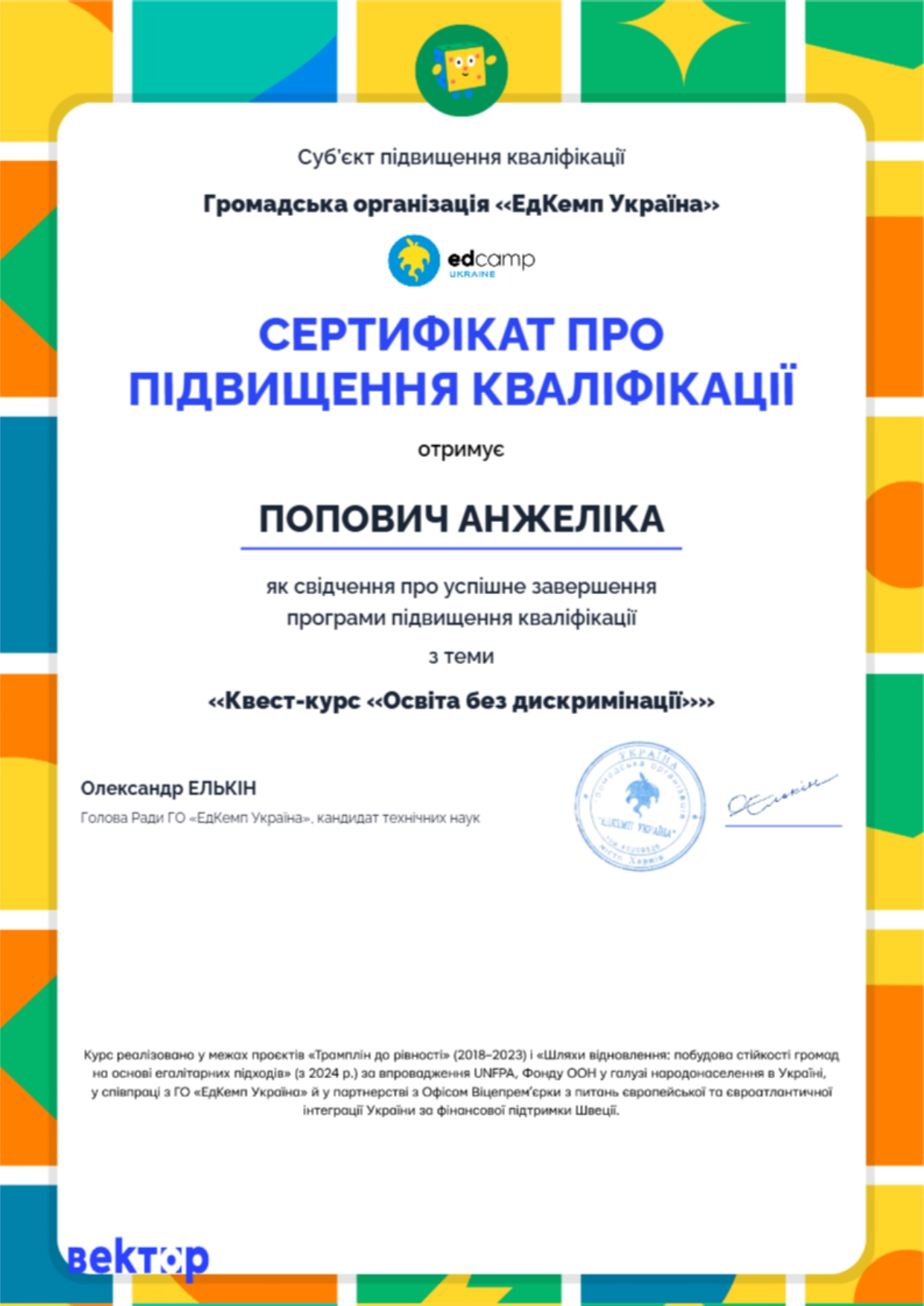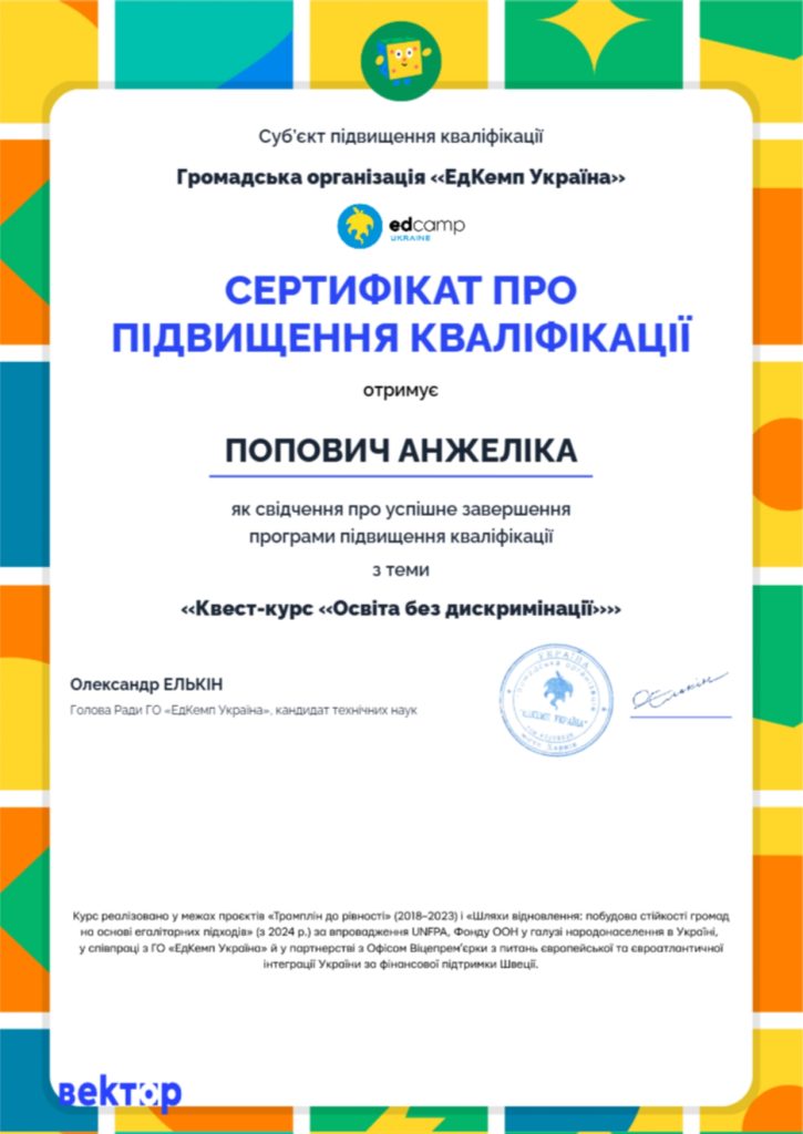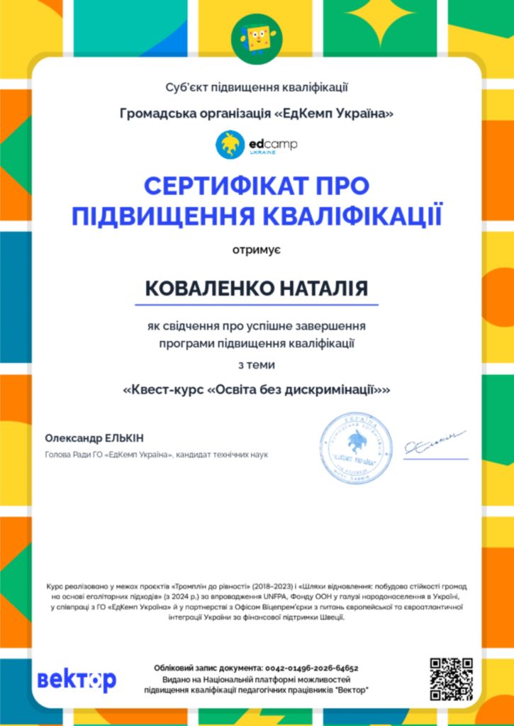 - завершили програму підвищення кваліфікації з теми «Квест-курс “Освіта без дискримінації”» (практико-орієнтований мультимедійний курс) на національній платформі можливостей підвищення кваліфікації педагогічних працівників «Вектор» (30 год).